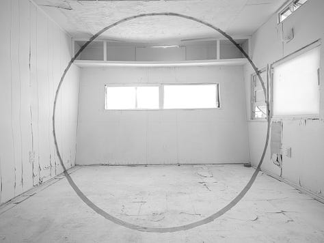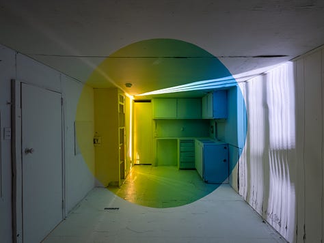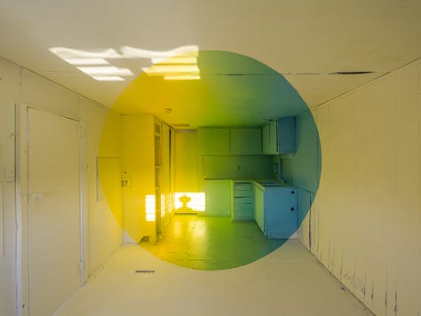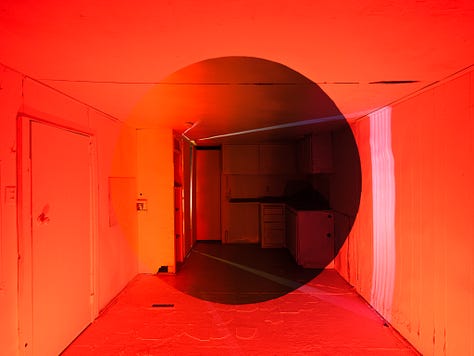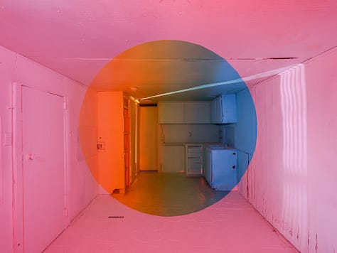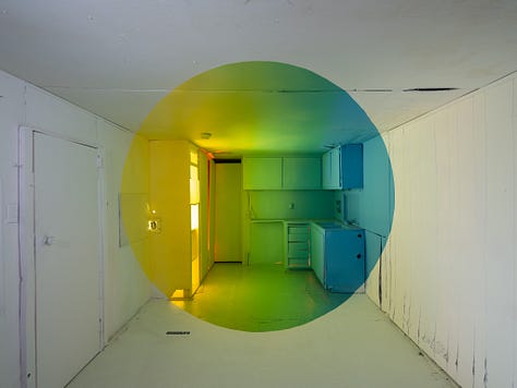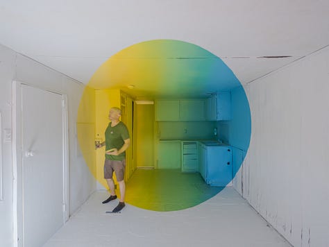In 2022, I created an installation consisting of three optical illusion paintings and a companion film, Transmutation House. It is an 86-second perfect loop that took 800 hours to complete. I ritualized the art-making process as a component of the creative act. Conceptually and personally, the intention of the artwork was to process the suicide deaths of two friends. The color palettes of the paintings are various combinations of our favorite colors. Despite tragic beginnings, it became a place where I wanted to spend time. In the off-hours, when people weren’t visiting the installation, I often found myself sitting quietly on the floor doing nothing. In hindsight, it seems like time spent taking shelter from the hurricane of capitalist productivity raging outside. In that monastic space I could simply be. Sad, at first. Then at peace. Quiet. Still. Happy, even.